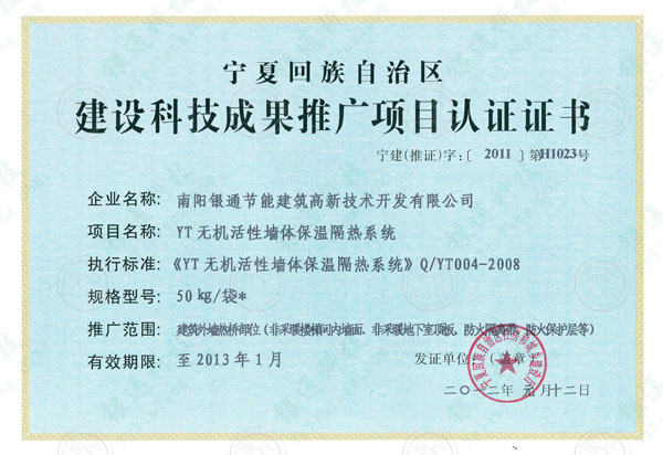 寧夏回族自治區(qū)建設(shè)科技成果推廣項(xiàng)目認(rèn)證證書南陽銀通