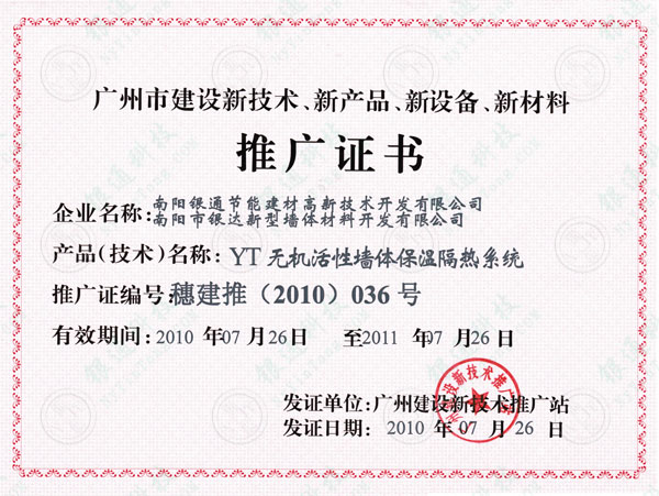 南陽(yáng)銀通廣州市建設(shè)新技術(shù)、新產(chǎn)品、新設(shè)備、新材料推廣證書(shū)