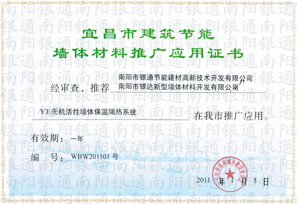 宜昌市建筑節(jié)能墻體材料推廣應用證書 經審查,推薦南陽市銀通節(jié)能建材高新技術開發(fā)有限公司,南陽市銀達新型墻體材料開發(fā)有限公司,YT無機活性墻體保溫隔熱系統(tǒng)在我市的推廣應用。 有效期:一年 編號:WBW201101號 2011年1月5日