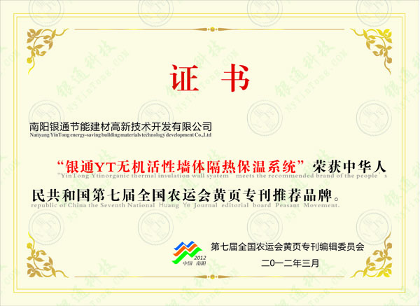 證書 南陽(yáng)銀通節(jié)能建材高新技術(shù)開(kāi)發(fā)有限公司 “銀通YT無(wú)機(jī)活性墻體隔熱保溫系統(tǒng)”榮獲中華人民共和國(guó)第七屆全國(guó)農(nóng)運(yùn)會(huì)黃頁(yè)專刊推薦品牌。 第七屆全國(guó)農(nóng)運(yùn)會(huì)黃頁(yè)專刊編輯委員會(huì) 二零一二年三月