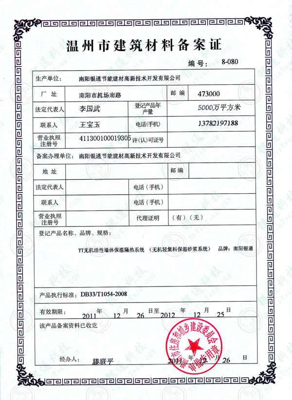 溫州市建筑材料備案證 編號:8-080 生產(chǎn)單位:南陽銀通節(jié)能建材高新技術(shù)開發(fā)有限公司 登記產(chǎn)品名稱、品牌、規(guī)格:YT無機活性墻體保溫隔熱系統(tǒng)(無機輕集料保溫砂漿系統(tǒng)) 品牌:南陽銀通 產(chǎn)品執(zhí)行標(biāo)準(zhǔn):DB33/T1054-2008 有效期:2011年12月26日至2012年12月25日 該產(chǎn)品備案資料已收訖 溫州市住房和城鄉(xiāng)建設(shè)委員會 審批專用章 2011年12月26日