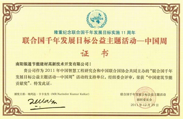 聯(lián)合國千年發(fā)展目標(biāo)公益主題活動(dòng)組織委員會 隆重紀(jì)念聯(lián)合國千年發(fā)展目標(biāo)實(shí)施11周年 授予:南陽銀通節(jié)能建材高新技術(shù)開發(fā)有限公司 中國建筑節(jié)能貢獻(xiàn)獎(jiǎng)