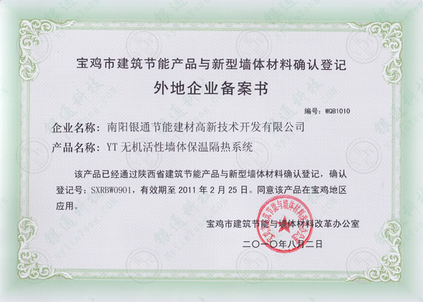 寶雞市建筑節(jié)能產(chǎn)品與新型墻體材料確認(rèn)登記外地企業(yè)備案書(shū) 編號(hào) NQB1010 企業(yè)名稱南陽(yáng)銀通節(jié)能建材高新技術(shù)開(kāi)發(fā)有限公司 產(chǎn)品名稱 YT無(wú)機(jī)活性墻體保溫隔熱系統(tǒng) 該產(chǎn)品已經(jīng)通過(guò)陜西省建筑節(jié)能產(chǎn)品與新型墻體材料確認(rèn)登記,確認(rèn)登記號(hào):SXRBW0901,有效期至2011年2月25日,同意該產(chǎn)品在寶雞地區(qū)應(yīng)用 寶雞市建筑節(jié)能與墻體材料改革辦公室 2010年8月2日