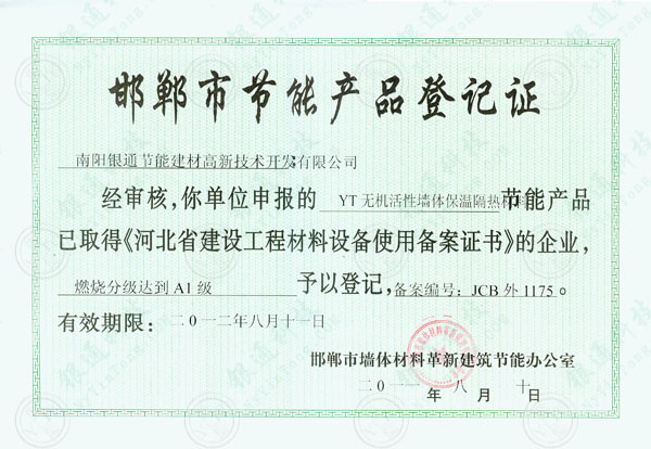 河北邯鄲市節(jié)能產(chǎn)品登記證 南陽(yáng)銀通節(jié)能建材高新技術(shù)開(kāi)發(fā)有限公司 南陽(yáng)市銀達(dá)新型墻體材料開(kāi)發(fā)有限公司 經(jīng)審查你單位申報(bào)的YT無(wú)機(jī)活性墻體保溫系統(tǒng)節(jié)能產(chǎn)品已取得河北省建設(shè)工程材料設(shè)備使用備案證書的企業(yè) 燃燒等級(jí)達(dá)到A1級(jí) 予以登記 備案編號(hào) JCB外1175號(hào) 有效期限2012年8月11日 邯鄲市墻體材料革新建筑節(jié)能辦公室 2011年8月10日