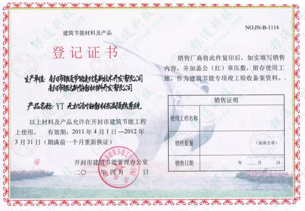 河南省開封市建筑節(jié)能材料及產(chǎn)品登記證書 備案編號NOJN-B-1114 生產(chǎn)單位南陽銀通節(jié)能建材高新技術(shù)開發(fā)有限公司 南陽市銀達(dá)新型墻體材料開發(fā)有限公司 產(chǎn)品名稱YT無機(jī)活性墻體保溫隔熱系統(tǒng) 以上材料及產(chǎn)品允許在開封市建筑節(jié)能工程上使用 有效期2001年4月1日至2012年3月31日 期滿前一個月重新?lián)Q證 開封市建筑節(jié)能管理辦公室