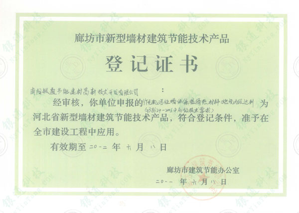 河北廊坊市新型墻材建筑節(jié)能技術(shù)產(chǎn)品登記證書