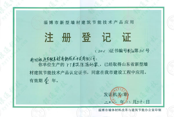 山東淄博市新型墻體建筑節(jié)能技術(shù)產(chǎn)品應(yīng)用注冊登記證2011證書編號第521號 南陽銀通節(jié)能建材高新技術(shù)開發(fā)有限公司 你單位生產(chǎn)的yt建筑保溫砂漿 已經(jīng)取得山東省新型墻材建筑節(jié)能技術(shù)產(chǎn)品認(rèn)定證書 同意在我市建設(shè)工程中應(yīng)用 有效期壹年 發(fā)證機關(guān) 淄博市墻體材料改革與建筑節(jié)能辦公室 二零零一八月三十一日
