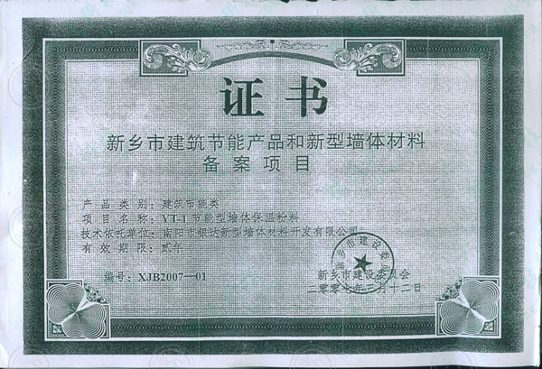 河南省新鄉(xiāng)市建筑節(jié)能產(chǎn)品和新型墻體材料備案證書 企業(yè)名稱 南陽市銀達(dá)新型墻體材料開發(fā)有限公司 單位地址 南陽市機(jī)場南路312國道西側(cè) 產(chǎn)品名稱YT無機(jī)活性墻體保溫隔熱系統(tǒng) 系統(tǒng)類別無機(jī)活性墻體保溫隔熱系統(tǒng) 證書編號XJB2007--01 有效期限二年 規(guī)格型號YT-A 產(chǎn)品型號50kg/袋 注冊商標(biāo)銀通 銀達(dá) 登記備案機(jī)關(guān) 濮陽市建設(shè)委員會 發(fā)證日期2007年3月12日