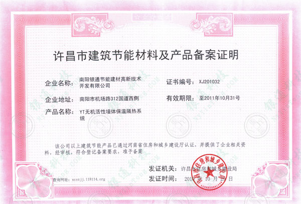 河南省許昌市建筑節(jié)能材料及產品備案證書 企業(yè)名稱 南陽市銀達新型墻體材料開發(fā)有限公司 單位地址 南陽市機場南路312國道西側 產品名稱YT無機活性墻體保溫隔熱系統(tǒng) 系統(tǒng)類別無機活性墻體保溫隔熱系統(tǒng) 證書編號XJ201032 有效期限至2011年10月31日 注冊商標銀通 銀達 該公司以上建筑節(jié)能產品已通過河南省建設廳認證 并提供了企業(yè)相關資料 同意備案 發(fā)證機關 許昌市住房和城鄉(xiāng)建設局 發(fā)證日期2010年10月25日