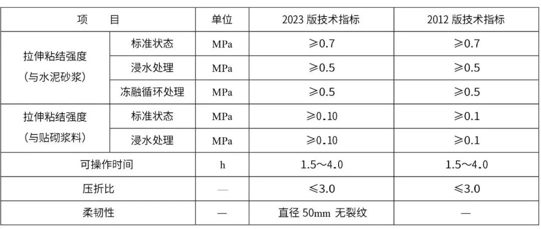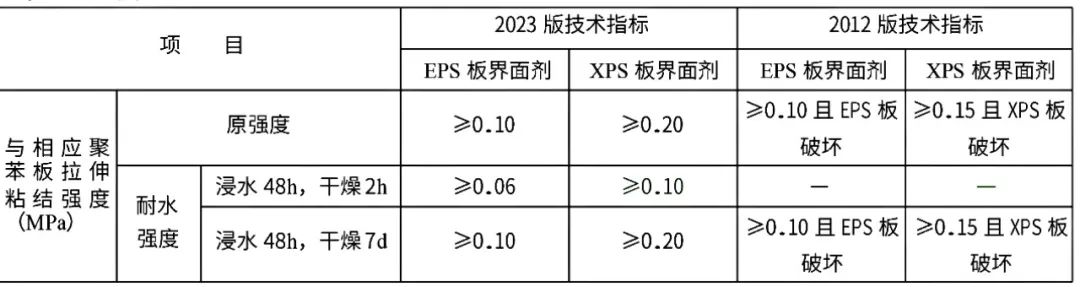 2023 版中取消了聚苯板膠粘劑、巖棉板膠粘劑,增加了粘貼硬泡聚氨酯板用膠粘劑、粘貼酚醛 泡沫板用膠粘劑,其性能指標(biāo)分別符合現(xiàn)行行業(yè)標(biāo)準(zhǔn)《硬泡聚氨酯板薄抹灰外墻外保溫系統(tǒng)材料》 JG/T 420、《酚醛泡沫板薄抹灰外墻外保溫系統(tǒng)材料》JG/T 515 的規(guī)定。