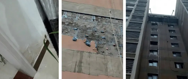江蘇某項(xiàng)目,共3棟31層高層住宅和2棟3層別墅,外墻采用聚氨酯復(fù)合保溫板外墻外保溫系統(tǒng),涂料飾面。該項(xiàng)目外保 溫構(gòu)造如下:基層(含界面劑處理)+砂漿找平層+黏結(jié)砂漿+聚氨 酯復(fù)合保溫板+抗裂砂漿(壓入耐堿玻纖網(wǎng)格布)+外墻膩?zhàn)?涂 料飾面。小區(qū)投入使用后陸續(xù)發(fā)現(xiàn)局部外飾面位置出現(xiàn)裂縫、起鼓脫殼情況,隨后開(kāi)裂情況加劇,出現(xiàn)滲漏,局部出現(xiàn)脫落的情況。