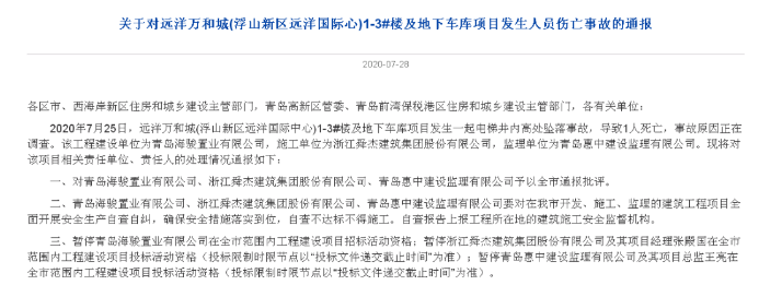 據(jù)記者了解,這已經(jīng)不是遠洋萬和城第一次發(fā)生事故,2020年7月25日,青島市住房和城鄉(xiāng)建設(shè)局發(fā)布了一起事故通報:遠洋萬和城(浮山新區(qū)遠洋國際中心)1-3#樓及地下車庫項目發(fā)生一起電梯井內(nèi)高處墜落事故,導致1人死亡。