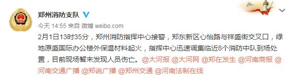 2月1日13時35分,鄭州消防指揮中心接警,鄭東新區(qū)心怡路與祥盛街交叉口,綠地原盛國際辦公樓外保溫材料起火,指揮中心迅速調(diào)集臨近8個消防中隊到場處置,目前現(xiàn)場暫未發(fā)現(xiàn)人員傷亡。