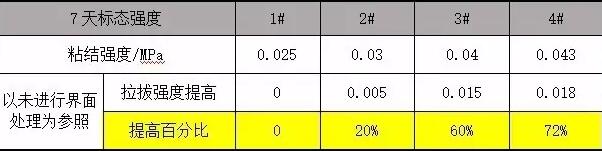 經(jīng)過(guò)7天后,測(cè)試標(biāo)態(tài)強(qiáng)度,:其中乳液+水泥+砂子的強(qiáng)度最大,乳液+水泥的強(qiáng)度次之,兩者都大于純?nèi)橐航缑鎰┨幚砗蟮膹?qiáng)度,未做界面處理的強(qiáng)度最低。