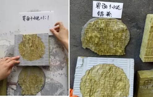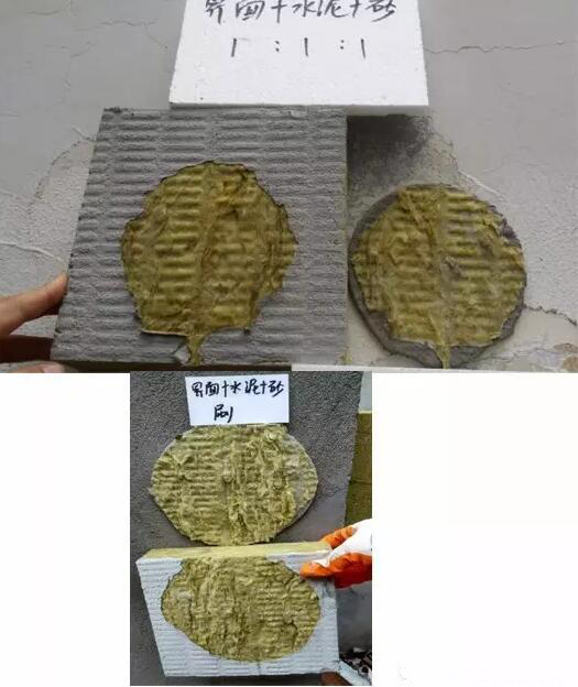 專業(yè)人員曾做過(guò)一組對(duì)比試驗(yàn),在墻上粘貼4組巖棉板,包括未涂刷界面劑的、涂覆乳液狀界面劑的、涂覆按照乳液:水泥=1:1界面劑的、涂覆乳液:水泥:混合砂=1:1:1界面砂漿。