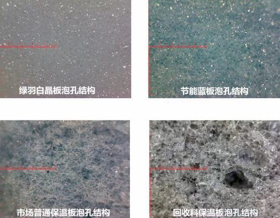下面是四種擠塑板的微觀結(jié)構(gòu)圖。白晶板的泡孔均勻且封閉。藍板泡孔封閉良好。黑板沒有泡孔基本沒有封閉。