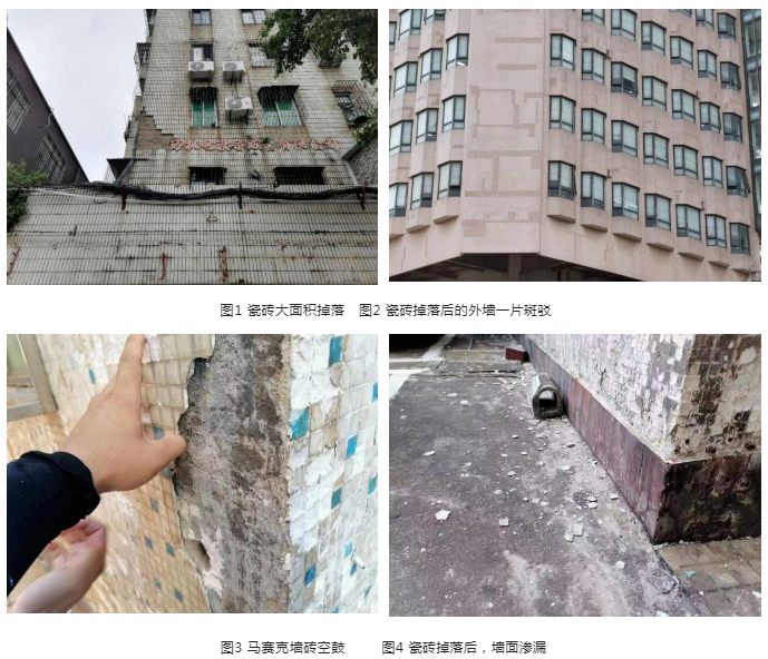 瓷磚脫落一方面有礙觀瞻,就像墻面得了 “牛皮癬”一樣,看上去特別不舒服;另外,瓷磚脫落容易砸傷行人和車輛,危及樓下行人的生命安全,給社會公共安全造成較大危害。此外,瓷磚脫落,時間長了會引發(fā)墻體開裂,造成室內(nèi)墻體滲漏,墻面裝飾涂料或者墻紙發(fā)生起皮、脫落和霉變現(xiàn)象,給居民生活帶來諸多不便,而且維修起來費時費力費錢,成為不少居民的“心頭病”。圖1—4為?谑欣闲^(qū)外墻瓷磚空鼓、脫落情況。