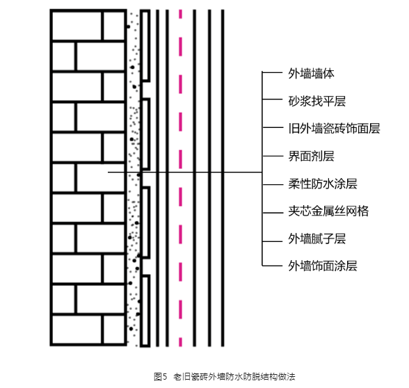 針對老舊小區(qū)外墻脫落問題,筆者公司研發(fā)了一種老舊瓷磚外墻防水防脫施工工藝,該工藝已經(jīng)在海南省舊改外墻項目大量應(yīng)用,均取得較好的施工效果,也申請了國家知識產(chǎn)權(quán)局的“實用新型專利”。該老舊瓷磚外墻防水防脫結(jié)構(gòu)做法見圖5。