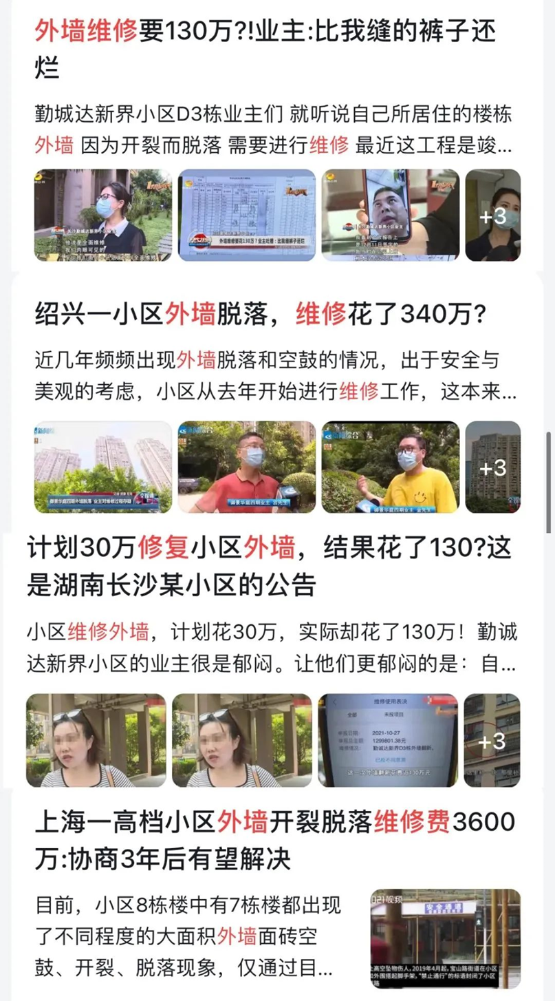 梳理近年被爆出的關于住宅維修的民生新聞可以看出,目前我國大部分的住宅后期維修費都貴得讓業(yè)主們難以接受。比如,長沙某小區(qū)樓體維修需花835萬;紹興某小區(qū)外墻空鼓維修花了340萬;南寧某小區(qū)外墻維修費用開出2979萬高價;就連幾塊瓷磚脫落,廣西某小區(qū)也開出了6500元的維修費........