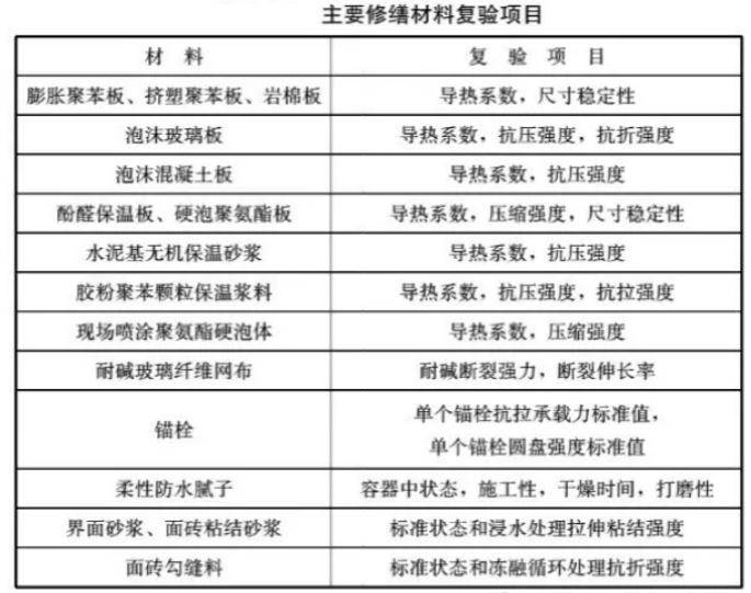 進場驗收+監(jiān)理見證取樣復驗(修復面積合計≥1000㎡時)+外墻外保溫粘貼拉拔試驗(修復面積合計≥1000㎡時)+紅外熱工缺陷檢測